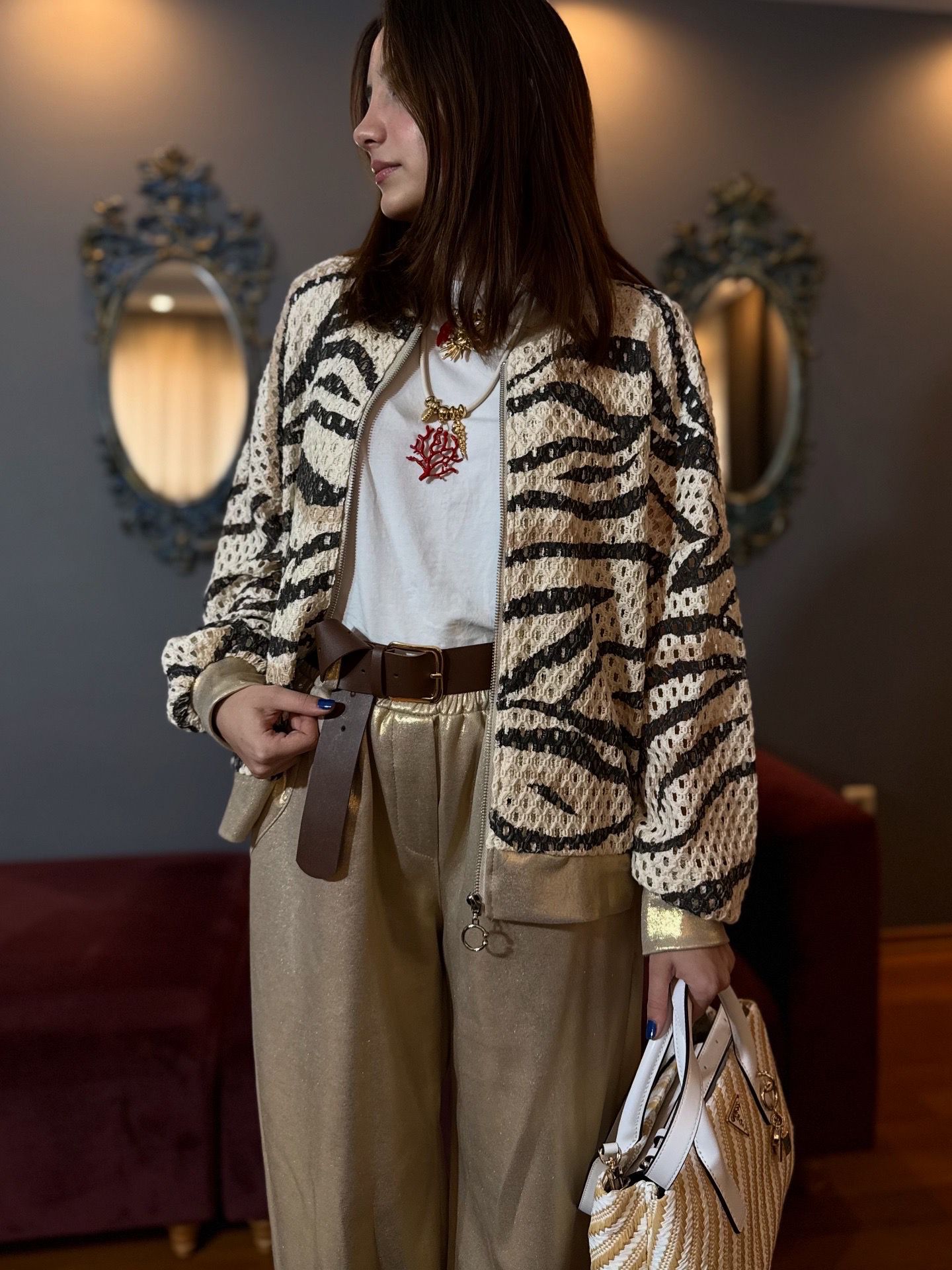 Genel tarzı itibariyle şık ve spor unsurları birleştiren bir “jogger” pantolon tarzındadır. Bu tip pantolonlar hem konforlu hem de gösterişli bir görünüm sunar, özellikle gece kombinlerinde veya dikkat çekici gündelik stillerde tercih edilir.