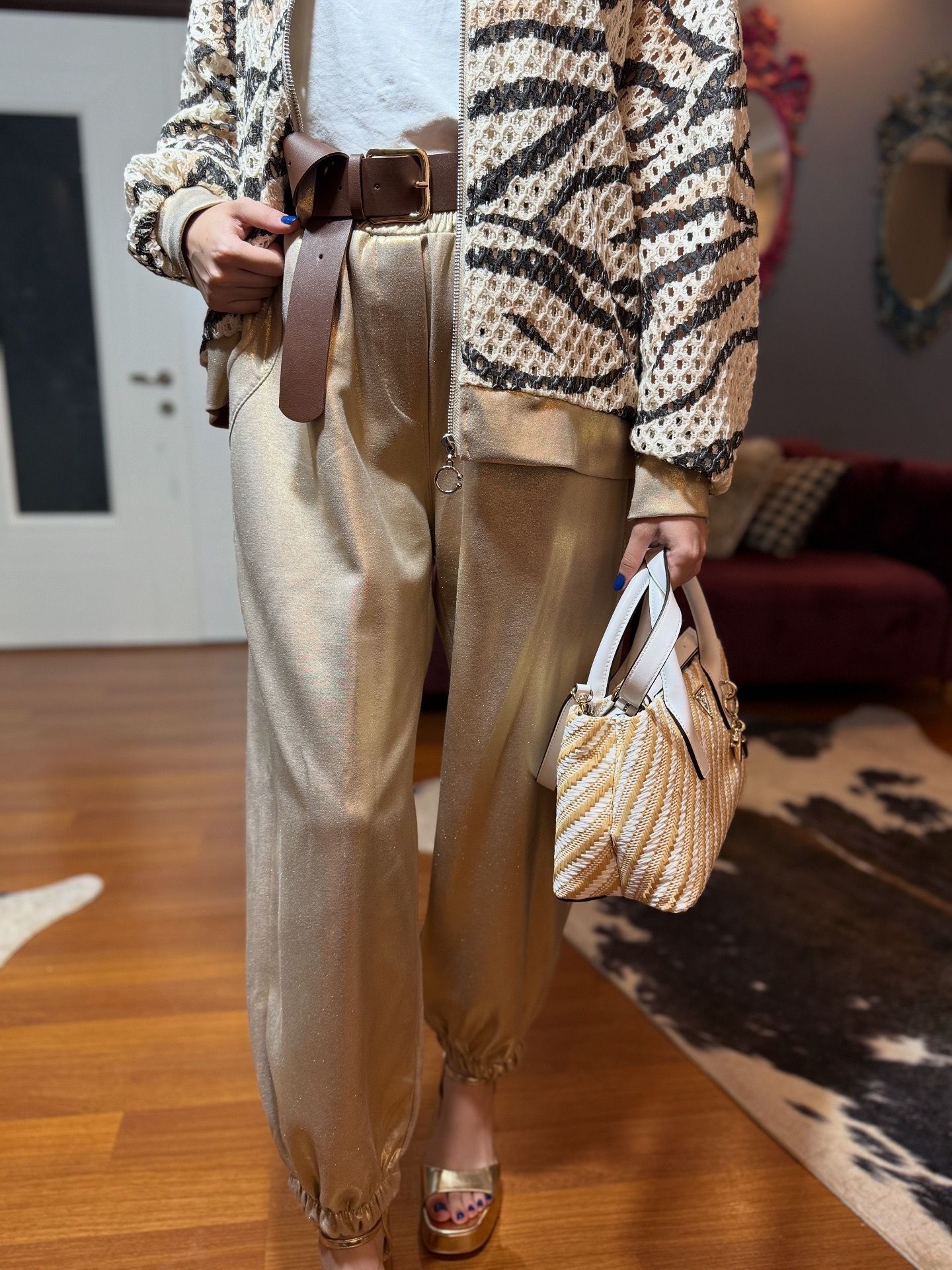 Aurora Gold Parlak Kemer Detaylı İthal Pantolon